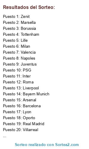 Lista de participantes: Barcelona, Real Madrid, Atletico de Madrid, Villarreal, Valencia, Tottenham, Manchester U., Manchester C., Chelsea, Liverpool, Arsenal, Inter, Milan, Napoles, Juventus, Roma, Zenit, Lyon, Marsella, Borussia, Bayern Munich, Lille, Oporto, PSG.