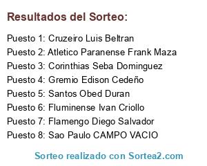 Lista de participantes: Gremio Edison Cedeño, Atletico Paranense Frank Maza, Fluminense Ivan Criollo, Corinthias Seba Dominguez, Sao Paulo CAMPO VACIO, Santos Obed Duran, Flamengo Diego Salvador, Cruzeiro Luis Beltran.