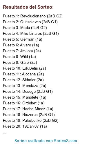 Lista de participantes: 19Dani07 (1a), Ajocana (2a), Alfonsobis (2aB G2), Alvaro (1a), Desege (2aB G1), Fernanbetico (2aB G2), Frajua (2aB G1), Ivis (2aB G2), JmJota (2a), Lembo (1a), Maestroo (1a), Manolete (1a), Medu (2aB G2), Mendaza (2a), Milio Linares (2aB G1), Mpl29 (2aB G2), Mushobetis1907 (2a), Niuzerus (2aB G1), NKO (2aB G2), Pakobetiko (2aB G2), Revolucionario (2aB G2), Skholer (2a), Teskiya (2aB G1), Tortuga (1a), Wild (1a), Zamue (2aB G1), Quitanieves (2aB G1), Ordobet (1a), German (1a), Nacho Mtnez (1a), Garp (2a), EduBetis (2a).