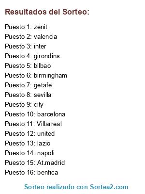 Lista de participantes: city, sevilla, bilbao, girondins, valencia, napoli, Villarreal, lazio, united, inter, birmingham, zenit, At.madrid, benfica, barcelona, getafe.