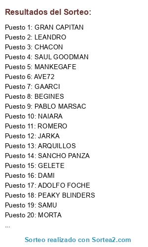 Lista de participantes: AVE72, SAUL GOODMAN, SANCHO PANZA, NAIARA BERITAKO, MR. CARLETTO, GRAN CAPITAN, ESTIWYE, SPEEDY TEAM, JOSE MANUEL FLOR, JANO ARKAUTE, ALBERTO MUÑIZ, JOTA, CORLEONE, LEANDRO, MANKEGAFE, ARQUILLOS, ARPALO88, MANUEL D, CARABOBO BALOMPIE, J.F.M., SUPERCLOWNS, REAL SABINILLAS C.F, JALONSO13, SERGI TEAM, SOBARRIBA, SERPMB, VICENTE PEREZ BEGINES, R, MONCHO, PABLO MARSAC, LOBITO C.F., GO ATLETI.