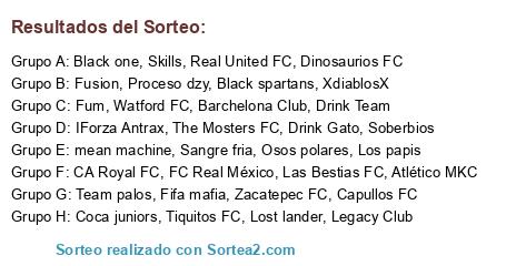 Lista de participantes: Tiquitos FC, Capullos FC, CA Royal FC, FC Real México, Drink Gato, Watford FC, Las Bestias FC, Drink Team, IForza Antrax, Legacy Club, Dinosaurios FC, Real United FC, Atlético MKC, Barchelona Club, Zacatepec FC, The Mosters FC, Black one, Fifa mafia, XdiablosX, mean machine, Black spartans, Team palos, Lost lander, Coca juniors, Fusion, Sangre fria, Soberbios, Fum, Skills, Los papis, Osos polares, Proceso dzy.