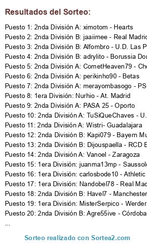 Lista de participantes: 1ª División xSamu-Herenveen, 1ª División Joselitorojas1-Fiorentina, 2ª División A: CometHeaven79-Chelsea FC, 1ª Division Empepinator-Atletico de Madrid.