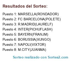Lista de participantes: BAYERN(FRANJM), BORUSSIA(XUNGO), INTER(PICHUFLASH), R.MADRID(LAURELF), NAPOLI(VIXTOR), MARSELLA(RONDADOR), M.CITY(JUANMA), FC BARCELONA(POLETE).