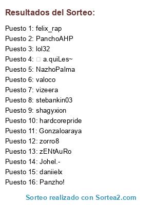 Lista de participantes: fulano360, caverdi(jonathan), Fusingip07, daniroquai, gonzalitroxx, charlesmariano, juako1596, blinblinetalex, malitroxx, seba10pra, pollomagico1, cf l alexis 9, sadinhox 17pro, andres donders, elmanh, ojm77.