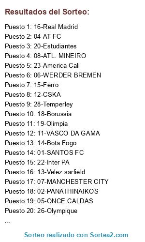 Lista de participantes: 01-SANTOS FC, 02-PANATHINAIKOS, 03-LANUS, 04-AT FC, 05-ONCE CALDAS, 06-WERDER BREMEN, 07-MANCHESTER CITY, 08-ATL. MINEIRO, 09-SAN LORENZO, 10-BOCA, 11-VASCO DA GAMA, 12-CSKA, 13-Velez sarfield, 14-Bota Fogo, 15-Ferro, 16-Real Madrid, 17-Peñarol, 18-Borussia, 19-Olimpia, 20-Estudiantes, 21-Atletico Tucuman, 22-Inter PA, 23-America Cali, 24-Colon, 25-Libertad, 26-Olympique, 27-Godoy Cruz, 28-Temperley.