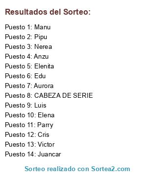 Lista de participantes: Cris, Aurora, Elena, Elenita, Manu, Luis, Pipu, Edu, Victor, Juancar, Parry, Nerea, Anzu, CABEZA DE SERIE.