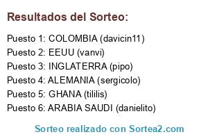 Lista de participantes: ARABIA SAUDI (danielito), ALEMANIA (sergicolo), INGLATERRA (pipo), COLOMBIA (davicin11), EEUU (vanvi), GHANA (tililis).
