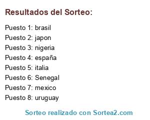 Lista de participantes: Senegal, nigeria, brasil, españa, japon, italia, uruguay, mexico.