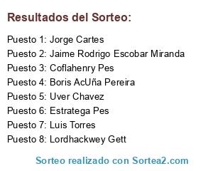 Lista de participantes: Luis Torres, Lordhackwey Gett, Estratega Pes, Jaime Rodrigo Escobar Miranda, Boris AcUña Pereira, Coflahenry Pes, Jorge Cartes, Uver Chavez.