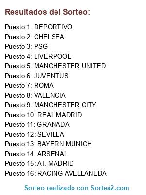Lista de participantes: GRANADA, LIVERPOOL, JUVENTUS, MANCHESTER CITY, ARSENAL, BAYERN MUNICH, REAL MADRID, SEVILLA, AT. MADRID, PSG, CHELSEA, DEPORTIVO, MANCHESTER UNITED, VALENCIA, RACING AVELLANEDA, ROMA.