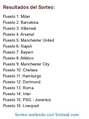 Lista de participantes: Villarreal, Manchester United, Chelsea, Milan, Manchester City, Roma, Napoli, Barcelona, Arsenal, Dortmund, Bayern, Inter, Liverpool, Hamburgo, Atlético, PSG - Juventus.