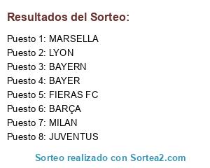 Lista de participantes: FIERAS FC, LYON, MARSELLA, BARÇA, BAYERN, BAYER, JUVENTUS, MILAN.