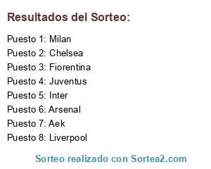 Lista de participantes: Milan, Inter, Fiorentina, Arsenal, Chelsea, Aek, Juventus, Liverpool.