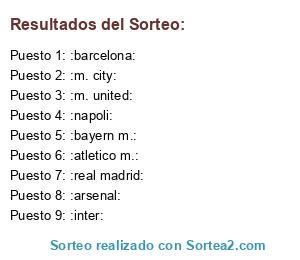 Lista de participantes: :barcelona:, :bayern m.:, :m. city:, :m. united:, :real madrid:, :arsenal:, :atletico m.:, :inter:, :napoli:.