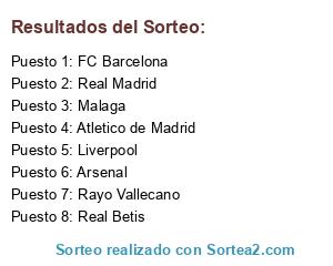 Lista de participantes: Atletico de Madrid, Malaga, Arsenal, FC Barcelona, Liverpool, Rayo Vallecano, Real Betis, Real Madrid.