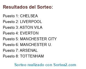 Lista de participantes: ASTON VILA, MANCHESTER U., MANCHESTER CITY, ARSENAL, CHELSEA, EVERTON, TOTTENHAM, LIVERPOOL.