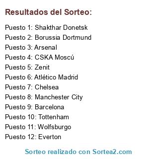 Lista de participantes: Tottenham, Shakthar Donetsk, Wolfsburgo, Borussia Dortmund, Atlético Madrid, Barcelona, Everton, CSKA Moscú, Arsenal, Chelsea, Manchester City, Zenit.