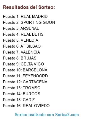 Lista de participantes: CADIZ, TROMSO, BURGOS, REAL OVIEDO, REAL MADRID, FEYENOORD, SPORTING GIJON, BARCELONA, VENECIA, REAL BETIS, ARSENAL, CELTA VIGO, BRUJAS, VALENCIA, CARTAGENA, AT BILBAO.