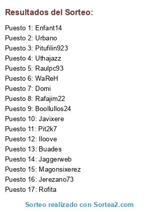 Lista de participantes: Domi, Raulpc93, WaReH, Pit2k7, Magonsixerez, Rofita, Boollullos24, Rafajim22, Urbano, Iloove, Jerezano73, Pitufilin923, Uthajazz, Jaggerweb, Javixere, Buades, Enfant14.