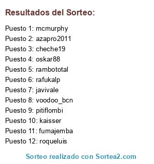 Lista de participantes: rambototal, pitiflombi, kaisser, voodoo_bcn, mcmurphy, javivale, fumajemba, cheche19, rafukalp, oskar88, azapro2011, roqueluis.