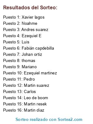Lista de participantes: Leo de boom, Pedro, Carlos, Ezequiel martinez, Ezequiel E, Mariano, Luis, thomas, Andres suarez, Johan ortiz, Fabián capdebilla, Xavier lagos, Martin suarez, Noahme, Martin diaz, Martin resek.