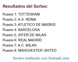 Lista de participantes: REAL MADRID, TOTTENHAM, BARCELONA, MANCHESTER UNITED, INTER DE MILAN, A.C. MILAN, A.S. ROMA, ATLETICO DE MADRID.