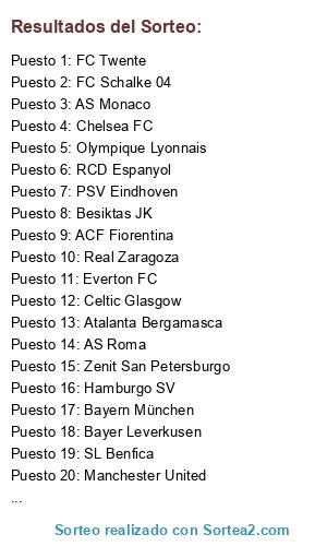 Lista de participantes: AS Monaco, Sporting Clube de Portugal, Ajax Amsterdam, West Ham United, SS Lazio, Hamburgo SV, Olympique Lyonnais, Liverpool FC, TSG 1899 Hoffenheim, Chelsea FC, Feyenoord Rotterdam, Parma FC, Atalanta Bergamasca, Newcastle United FC, Spartak Moscow, Lille OSC, Everton FC, Arsenal FC, Athletic Club de Bilbao, Real Zaragoza, Genoa FC, Bayern München, VfB Stuttgart, Manchester City, RCD Mallorca, Valencia CF, FC Schalke 04, Manchester United, Besiktas JK, Atlético de Madrid, Olympiakos CFP, FC Porto, Real Madrid CF, París Saint Germaín, Olympique Marseille, PSV Eindhoven, AS Roma, VfL Wolfsburgo, FC Barcelona, Blackburn Rovers, RCD Espanyol, Borussia Dortmund, RC Celta de Vigo, Bayer Leverkusen, USC Palermo, Internazionale Milano, Zenit San Petersburgo, Fulham FC, AC Milan, ACF Fiorentina, Borussia Mönchengladbach, Celtic Glasgow, CSKA Moscow, FC Twente, Galatasaray SK, Juventus de Turín, Sevilla CF, Shakthar Donetsk, SL Benfica, SSC Napoli, Tottenham Hotspur, Udinese Calcio, US Sampdoria, Werder Bremen.