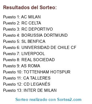 Lista de participantes: AC MILAN, AS ROMA, BORUSSIA DORTMUND, CA TALLERES, CD LEGANÉS, INTER DE MILAN, LIVERPOOL, RC CELTA, RC DEPORTIVO, REAL SOCIEDAD, SL BENFICA, TOTTENHAM HOTSPUR, UNIVERSIDAD DE CHILE CF.