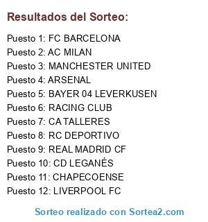 Lista de participantes: CA TALLERES, RC DEPORTIVO, FC BARCELONA, AC MILAN, REAL MADRID CF, ARSENAL, LIVERPOOL FC, BAYER 04 LEVERKUSEN, RACING CLUB, MANCHESTER UNITED, CHAPECOENSE, CD LEGANÉS.