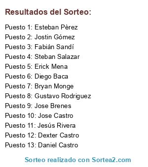 Lista de participantes: Bryan Monge, Erick Mena, Diego Baca, Esteban Pèrez, Jose Castro, Daniel Castro, Dexter Castro, Fabián Sandí, Jostin Gómez, Jesús Rivera, Steban Salazar, Jose Brenes, Gustavo Rodriguez.