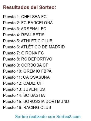 Lista de participantes: ARSENAL FC, ATHLETIC CLUB, ATLÉTICO DE MADRID, FC BARCELONA, SC BASTIA, REAL BETIS, CADIZ CF, CHELSEA FC, CORDOBA CF, RC DEPORTIVO, BORUSSIA DORTMUND, GIRONA FC, GREMIO FBPA, JUVENTUS, CA OSASUNA, RACING CLUB.