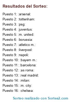 Lista de participantes: :barcelona:, :bayern m.:, :juventus:, :m. city:, :psg:, :real madrid:, :as roma:, :tottenham:, :arsenal:, :borussia:, :chelsea:, :atletico m.:, :liverpool:, :m. united:, :milan:, :napoli:.