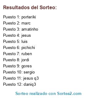 Lista de participantes: jordi, pichichi, daniq3, jesus, gores, marc, ruben, sergio, luis, porteriki, amatinho, jesus q3.