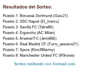 Lista de participantes: Real Madrid CF (Furru_asesino21), SSC Napoli (El_mercu), Ergoncho (AC Milan), Manchester United FC (R9ronie), Borussia Dortmund (Guiu21), Sevilla FC (Tatre86), Spurs (Rmcf80army), Arsenal FC (Jemi666).