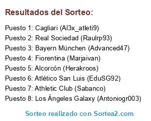 Lista de participantes: Athletic Club (Sabanco), Cagliari (Al3x_atleti9), Fiorentina (Marjaivan), Real Sociedad (Raulrp93), Los Ángeles Galaxy (Antoniogr003), Alcorcón (Herakroos), Atlético San Luis (EduSG92), Bayern München (Advanced47).
