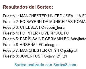 Lista de participantes: JUVENTUS FC-javy_21_21, CHELSEA FC-ruben_fiera, FC INTER / LIVERPOOL FC, ARSENAL FC-elnager, FC BAYERN DE MÚNICH / AS ROMA, MANCHESTER CITY FC-jseligrat, PARÍS SAINT-GERMAIN FC-Adryjimfer17, MANCHESTER UNITED / SEVILLA FC.