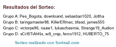 Lista de participantes: taringamaster88, will_crap, sebastian1020, HUBERTO_75, xCrISTiAhNx, Jottha, naaw1, victorpe96, james555, downloand, Pes_Bogota, Strange19_Audion, KillerERmac, bfasd, ferco1912, lukaschesmie.