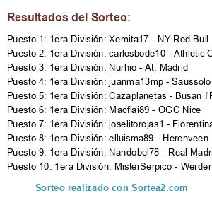 Lista de participantes: 1era División: Cazaplanetas - Busan I'Park, 1era División: Nurhio - At. Madrid, 1era División: Xemita17 - NY Red Bull, 1era División: elluisma89 - Herenveen, 1era División: Nandobel78 - Real Madrid, 1era División: joselitorojas1 - Fiorentina, 1era División: carlosbode10 - Athletic Club de Bilbao, 1era División: MisterSerpico - Werder Bremen, 1era División: juanma13mp - Saussolo, 1era División: Macflai89 - OGC Nice.