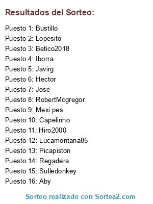 Lista de participantes: Iborra, Sulledonkey, Lopesito, Regadera, Betico2018, Javirg, RobertMcgregor, Lucamontana85, Aby, Mexi pes, Bustillo, Hector, Jose, Picapiston, Capelinho, Hiro2000.