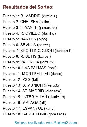 Lista de participantes: LAS PALMAS (moi), BARCELONA (gomasos), NANTES (pipo), ESPANYOL (vanvi), AT. MADRID (clanatm), PSG (kil), B. MUNICH (rivero86), MALAGA (alf), CHELSEA (bubo), SEVILLA (porcel), R. BETIS (baresi), INTER MILAN (danielito), R. OVIEDO (daniho), MONTPELLIER (david), R. MADRID (ermigui), SPORTING GIJON (davicin11), VALENCIA (jordi25), LEVANTE (javibross).