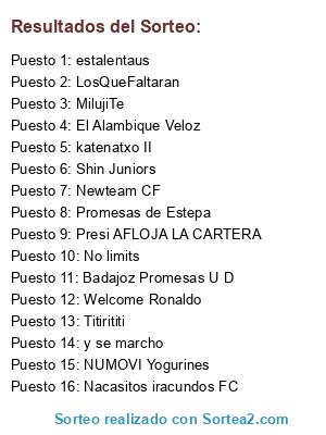 Lista de participantes: katenatxo II, MilujiTe, Welcome Ronaldo, Newteam CF, Promesas de Estepa, El Alambique Veloz, NUMOVI Yogurines, Titirititi, Presi AFLOJA LA CARTERA, LosQueFaltaran, y se marcho, estalentaus, Nacasitos iracundos FC, No limits, Badajoz Promesas U D, Shin Juniors.