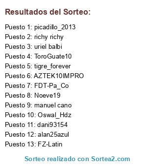 Lista de participantes: FDT-Pa_Co, tigre_forever, picadillo_2013, Noeve19, Oswal_Hdz, AZTEK10IMPRO, alan25azul, ToroGuate10, FZ-Latin, dani93154, manuel cano, uriel balbi, richy richy.