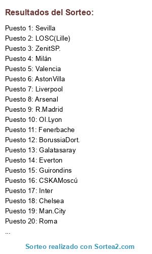 Lista de participantes: Arsenal, At.Madrid, BayernLeverkusen, BorussiaDort., Chelsea, Hamburgo, R.Madrid, Villareal, ZenitSP., AstonVilla, BayernMunich, Guirondins, Inter, LOSC(Lille), Man.City, Milán, PSG, Ol.Lyon, Shalke04, Man. United / Tottenhham, Barcelona, Benfica / Juventus, CSKAMoscú, Everton, Fenerbache, Galatasaray, Liverpool, Napoles, Ol.Marsella, Roma, Sevilla, Valencia.