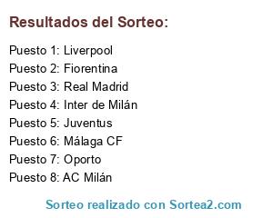 Lista de participantes: Oporto, Fiorentina, Málaga CF, Inter de Milán, Real Madrid, Liverpool, AC Milán, Juventus.
