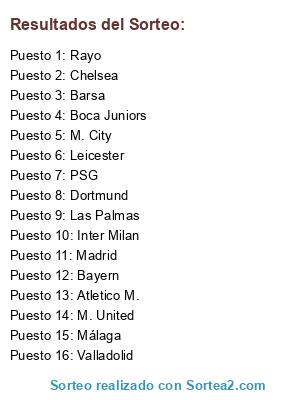 Lista de participantes: M. United, Valladolid, Bayern, Rayo, Boca Juniors, Dortmund, Inter Milan, Atletico M., Las Palmas, PSG, Barsa, Chelsea, Madrid, M. City, Leicester, Málaga.
