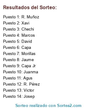 Lista de participantes: Capa, Capa Jr, Agus, Chechi, David, Jaume, Josep, Juanma, Marcos, Morillas, Xavi, R. Muñoz, R. Pérez, Victor.