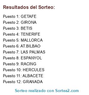 Lista de participantes: HERCULES, TENERIFE, ALBACETE, GRANADA, GETAFE, LAS PALMAS, ESPANYOL, RACING, MALLORCA, BETIS, AT.BILBAO, GIRONA.