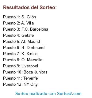 Lista de participantes: Liverpool, NY City, Boca Juniors, O. Marsella, At. Madrid, B. Dortmund, Tenerife, K. Kielce, S. Gijón, A. Villa, F.C. Barcelona, Getafe.