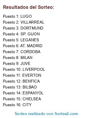 Lista de participantes: VILLARREAL, ELCHE, AT. MADRID, TOTTENHAM, MONACO, FIORE, MALAGA, DORTMUND, LIVERPOOL, CITY, SP. GIJON, BOCA.